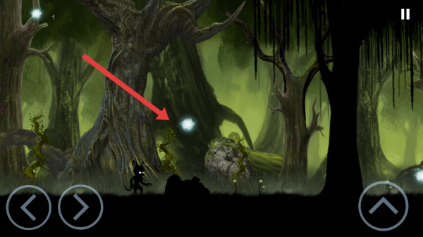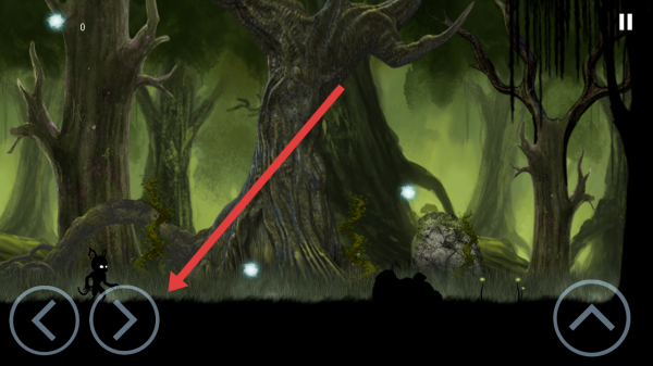 2、进入游戏关卡的森林场景,需要通过左下角方向键操控角色移动,收集场景内发光体。