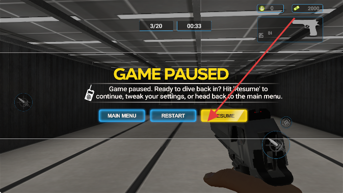 1、点“RESUME”继续!暂停界面别退出,3秒回到射击,节省重开时间,优先打靶心,每中1次。