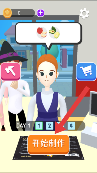 1、画面呈现初始制作环节,有角色、订单需求(苹果、牛油果)、【开始制作】按钮等,属于模拟经营或烹饪玩法,玩家需按订单制作对应料理。