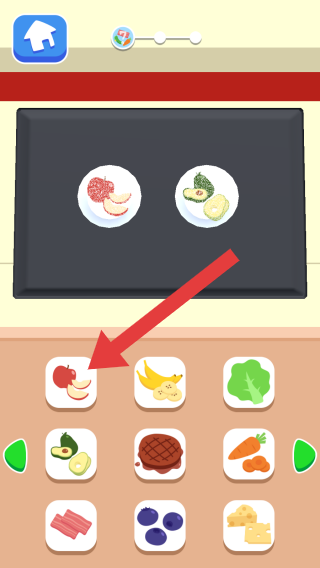 2、画面呈现食材选择与搭配环节,上方有成品展示(苹果、牛油果相关菜品),下方是各类食材(苹果、香蕉、生菜等),属于模拟烹饪玩法,玩家需挑选对应食材完成菜品制作。