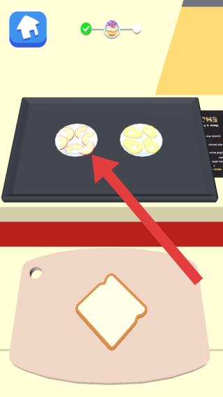 3、画面呈现烹饪操作环节,上方是烹饪器具及制作中的食材组合(如苹果片、蛋液等),下方是待加工的面包片,属于模拟烹饪玩法,玩家需按流程制作美食。