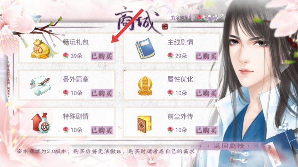 2、进入商城界面,可浏览畅玩礼包(39朵鲜花)、主线剧情(29朵鲜花)等项目,依据剩余鲜花数量,选择购买已解锁的内容。
