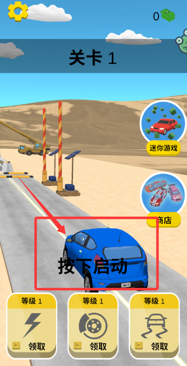 1、进入游戏,点击蓝色汽车处按下,即可启动汽车开始行驶。