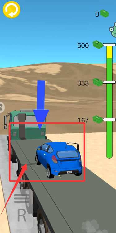 2、操控汽车前行,找准时机将其精准开上绿色货车的平板区域。