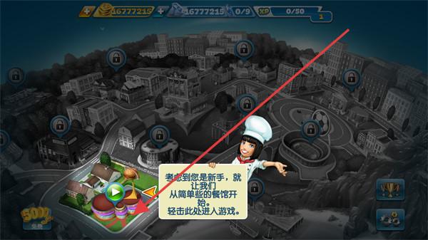 2、点“简单餐馆”!地图选小团圆,按指引进,1次解锁,做汉堡、薯条,顾客满意度+20。