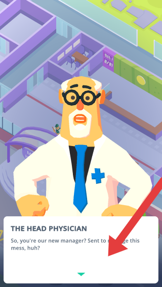 1、图中是首席医师角色,有对话“So,you'reournewmanager?Senttofixthismess,huh?”,呈现开局或新经理上任时的互动场景,属于模拟经营医院类,玩家将扮演经理管理医院。