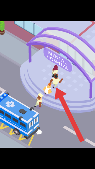2、呈现的是“MENTALHOSPITAL(精神病院)”场景,有医护人员引导患者入院、救护车等元素,属于模拟经营精神病院,玩家可体验医院运营管理玩法。