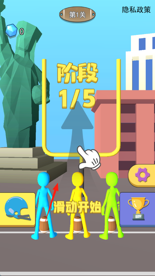 1、开局与角色“第1关阶段1/5”,选黄色火柴人,点“滑动开始”,场景有自由女神像、建筑,为美式橄榄球射门关卡。