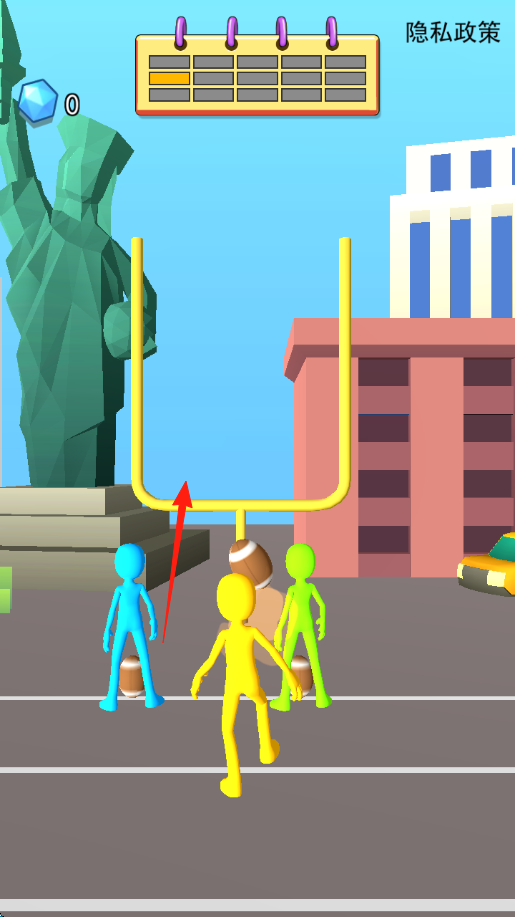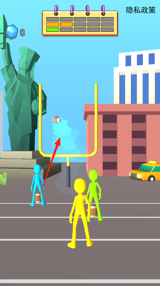 2、操作机制滑动屏幕控制橄榄球发射角度、力度,让球穿过黄色门框(球门),完成射门得分,屏幕上方显示进度条。