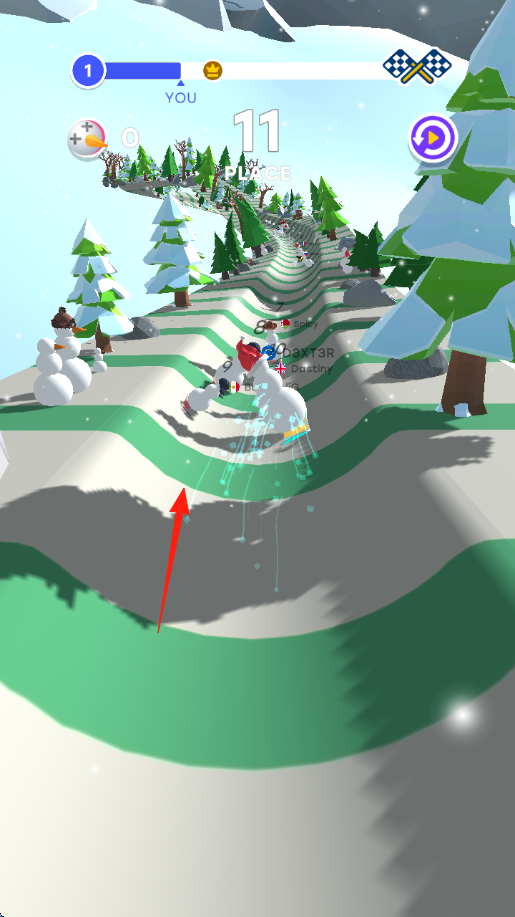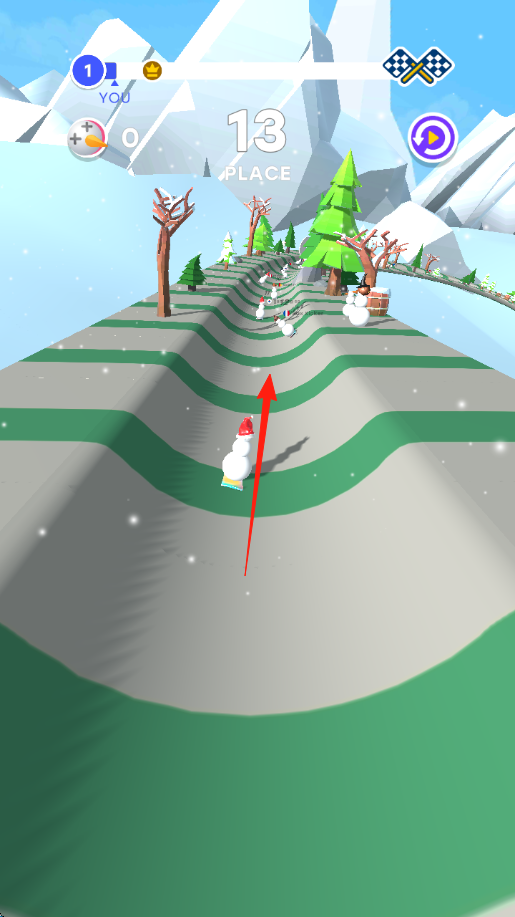 2、赛道操作在起伏的冰雪跑道,滑动屏幕控制雪人左右移动,躲避障碍(树木、雪人),超越对手(其他雪人角色)。