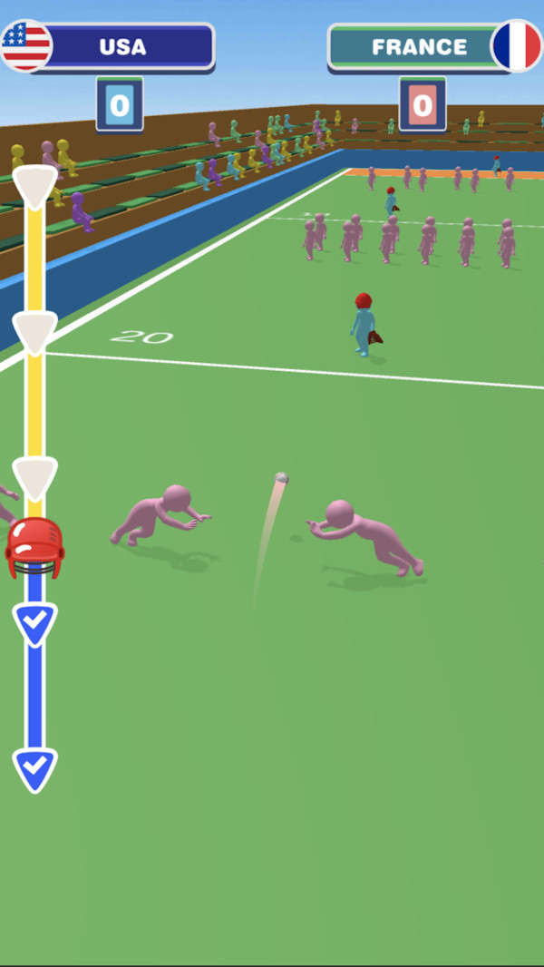 3、防守拦截法国队防守时,控制球员,预判棒球轨迹(红箭头),滑动屏幕拦截,阻止美国队得分,完成“投-打-守”循环对战。