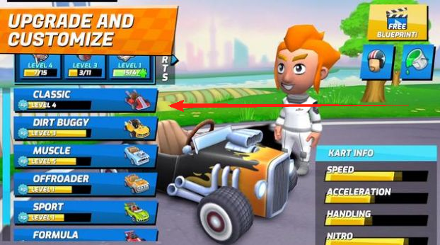 2、资源管理:合理分配收集到的金币与道具,通过成功完成比赛获得经验值,积累足够经验解锁新卡丁车与功能。