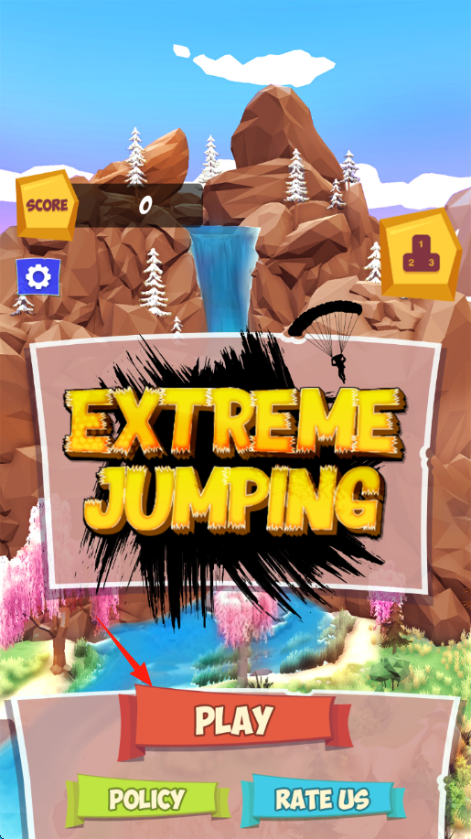 1、开局引导点击“PLAY”进入游戏,背景为山水场景,含“SCORE(得分)”“设置”等功能键。