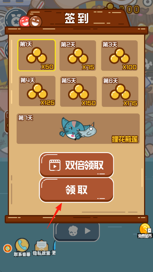 1、开局与福利主界面点播放键开始,有“签到”系统,累计签到领金币(第1天50)、角色(第7天“狸花莉莲”)。