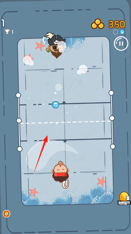 2、核心对战类似网球对战,控制角色(红带海盗),击打蓝色小球,在场地内对抗,将球打入对方区域得分。