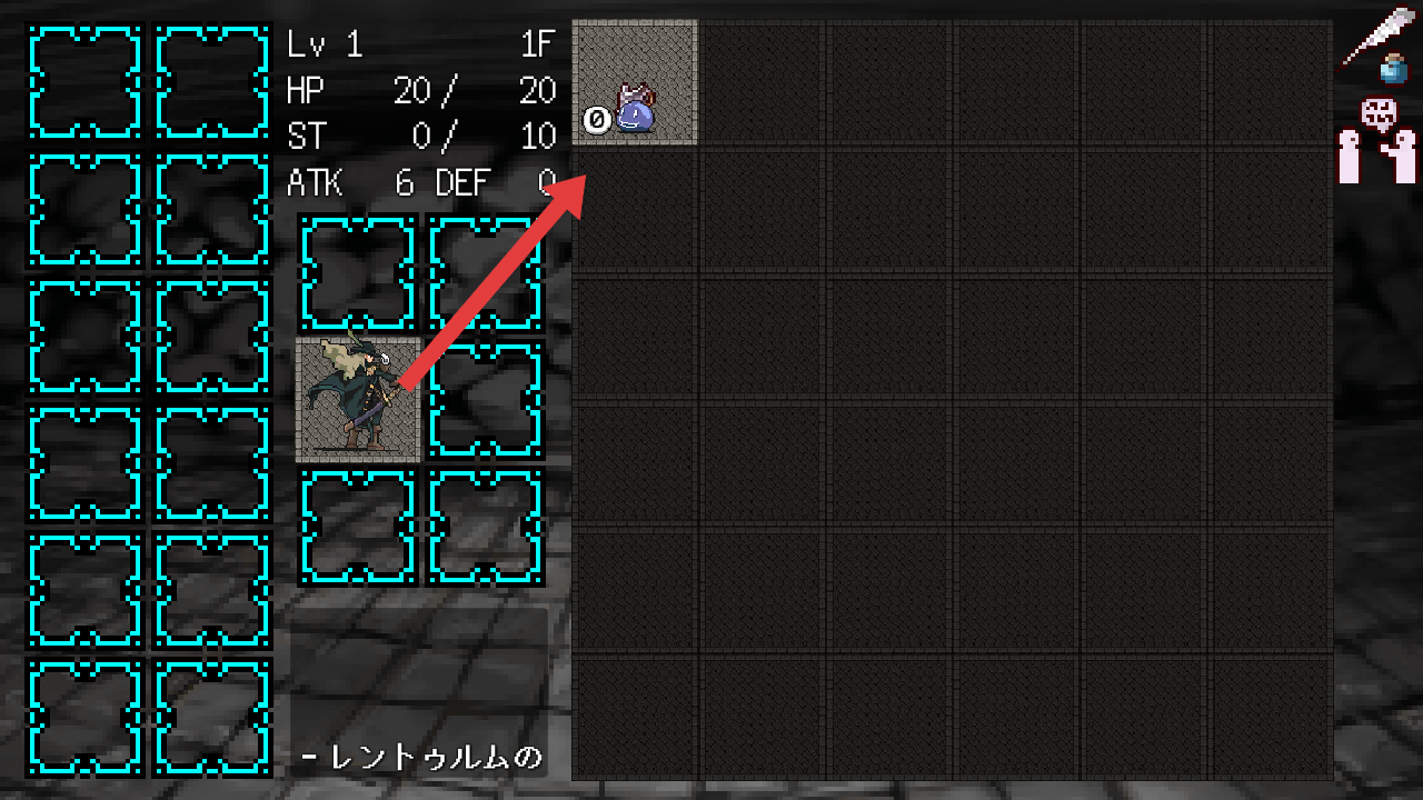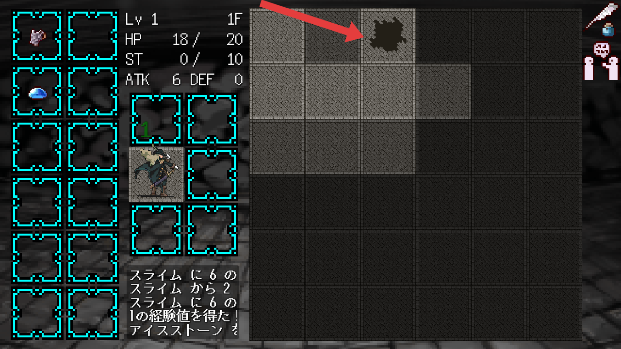 1、初始探索时,操控角色靠近箭头指向的紫色史莱姆怪物,触发战斗,依托角色初始攻击属性(ATK6)展开攻击,击败怪物后获取经验与掉落道具。