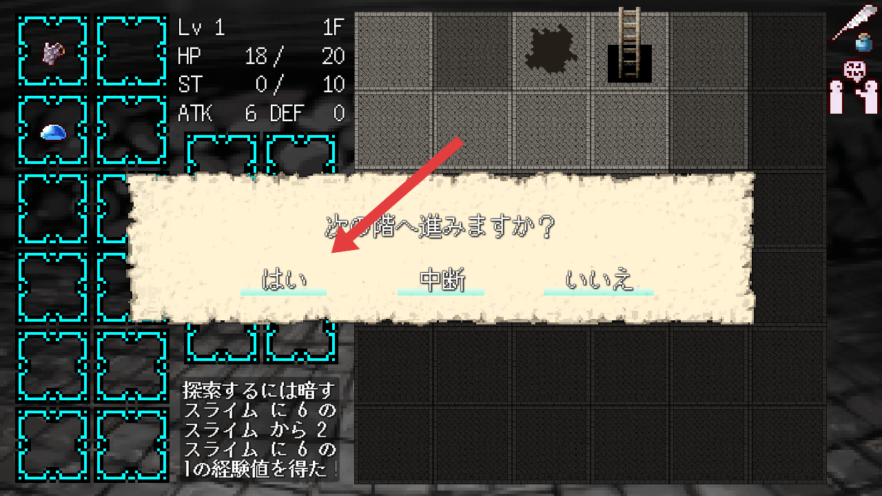 3、探索场景发现梯子后,触发“次の階へ進みますか”弹窗,选择【はい】选项,确认前往下一层地牢,开启更深区域的冒险与挑战。