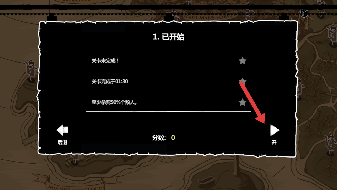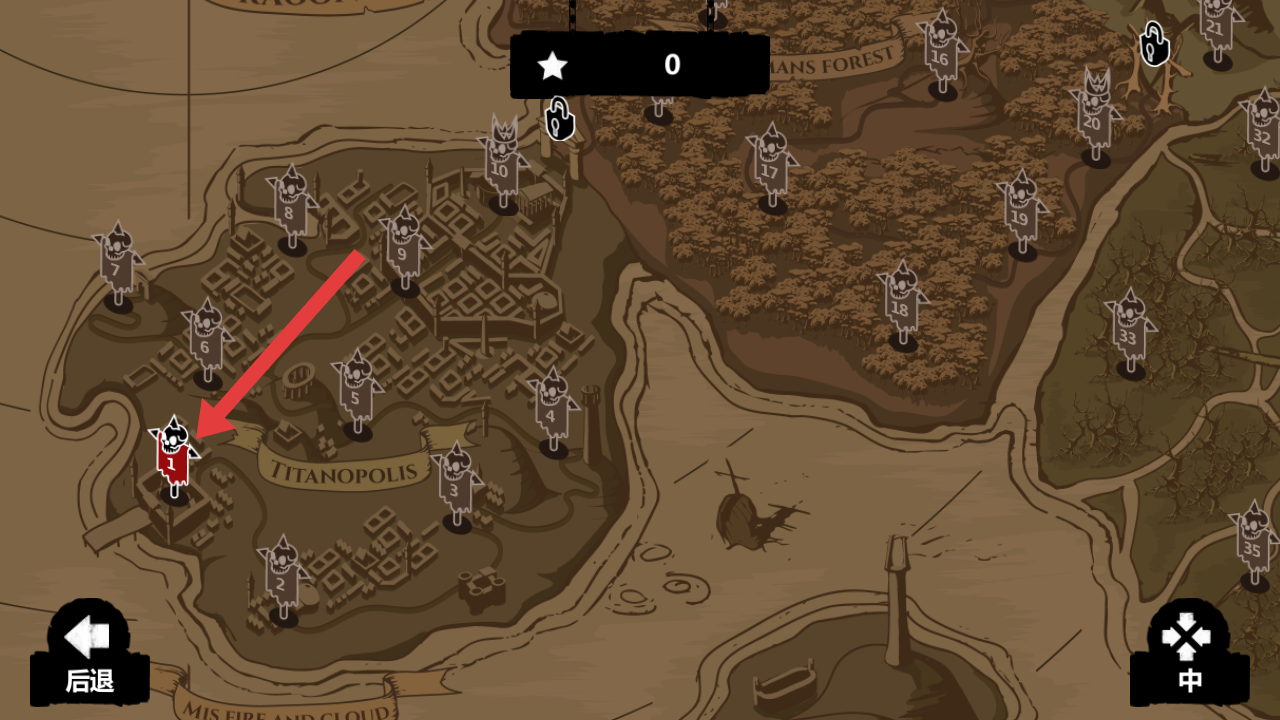 1、在地图界面,选择红色标识的【1号关卡】,查看其挑战目标与解锁状态,为冒险做好准备。