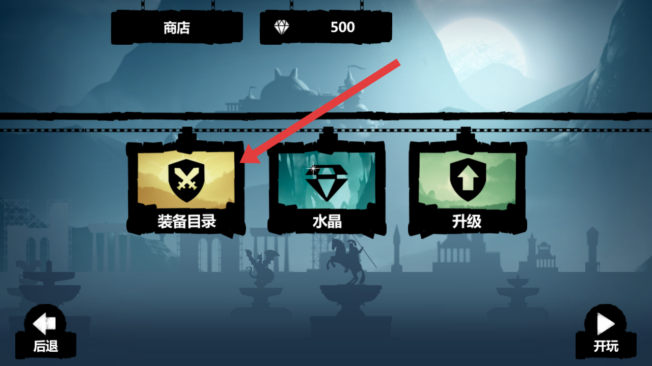 3、进入商店界面,借助【装备目录】【水晶】【升级】模块,消耗钻石(500)提升角色装备、资源与能力,增强战力。