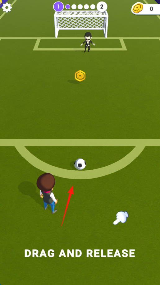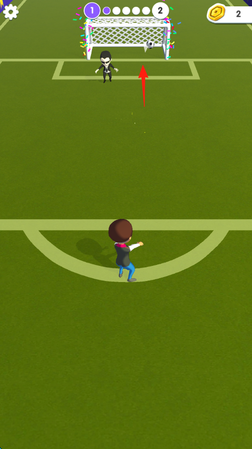 2、关卡目标在“1→2”关卡,射门需命中球门,同时可收集金币(黄币),积累金币数量(0→2)。