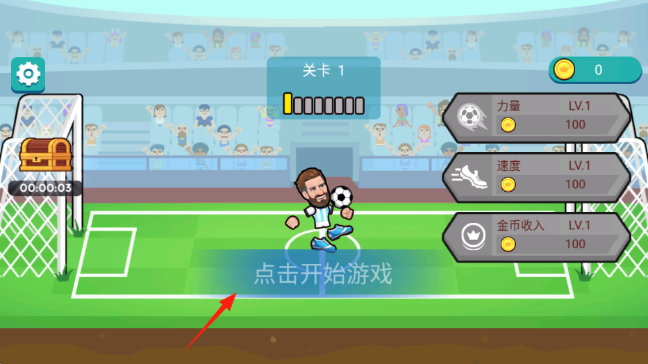 1、角色与属性以卡通化足球运动员为主角,有“力量”“速度”“金币收入”等属性(均LV.1),在“关卡1”开场。