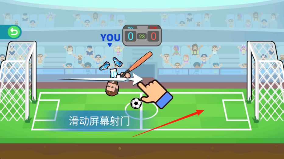 2、操作机制滑动屏幕控制射门,可借助道具(如棒球棍),调整角度、力度,让足球避开对手(守门员)。