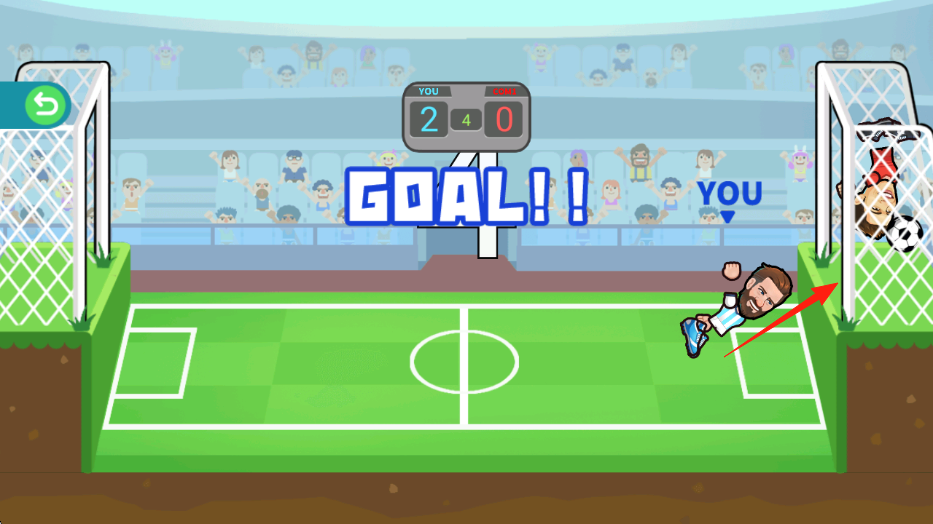 3、得分判定成功射门显示“GOAL!!”,更新比分(YOU2:0OPP),推进关卡,挑战更高难度射门。
