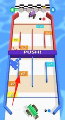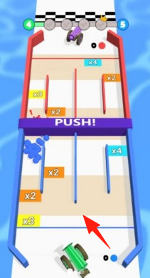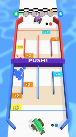 1、赛道布局水上赛道,“PUSH!”紫色障碍,需推动蓝色方块(带x2/x3等倍数),组合扩大体积。