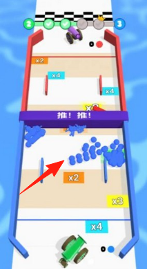 2、资源收集拾取赛道上的蓝色方块,合并后撞击对手(紫色车辆),利用倍数(x2/x4)增强推力。