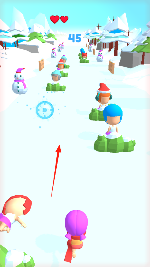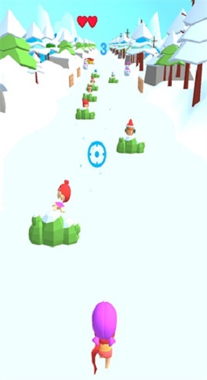 3、跑酷场景在雪地赛道,操控角色(粉紫装)躲避障碍(雪人、人物),按音乐节奏前进,累计距离,完成关卡。