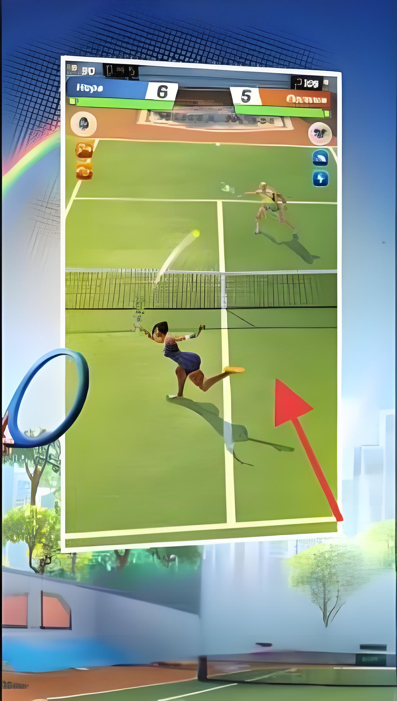 2、动态场景互动:包含8大主题球场,如“暴雨天台场”(湿滑地面影响跑动)、“沙漠绿洲场”(强风改变球路),部分场景设置可破坏障碍物(如击碎广告牌)。