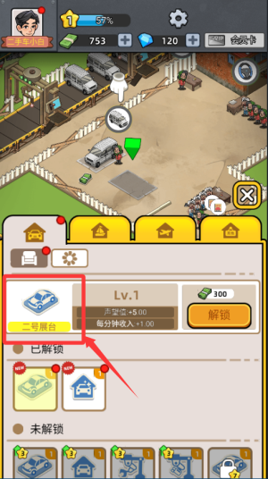 1、开局先了解各类车型的性能与收购价格,解锁展台,上架二手车。