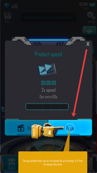 1、在加速弹窗,点【Free】(红箭头指向),获取2xspeed加成,提升机甲生产/战斗效率,限时免费。