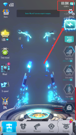 2、查看顶部资源(69.08K等),点击闪电图标(红箭头指向),补充能量,维持机甲运作。