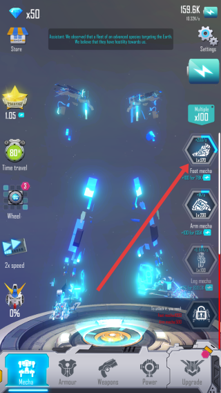 3、选“Fast-hands”(红箭头指向)升级项,消耗资源,提升机甲技能,增强战力,推进养成。