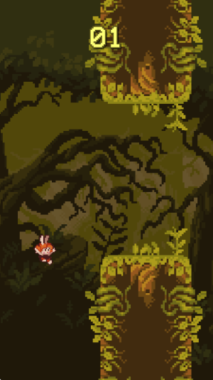 1、玩家需控制兔子在丛林中通过点击屏幕进行攀爬、跳跃,灵活利用树藤躲避障碍,完成冒险旅程。