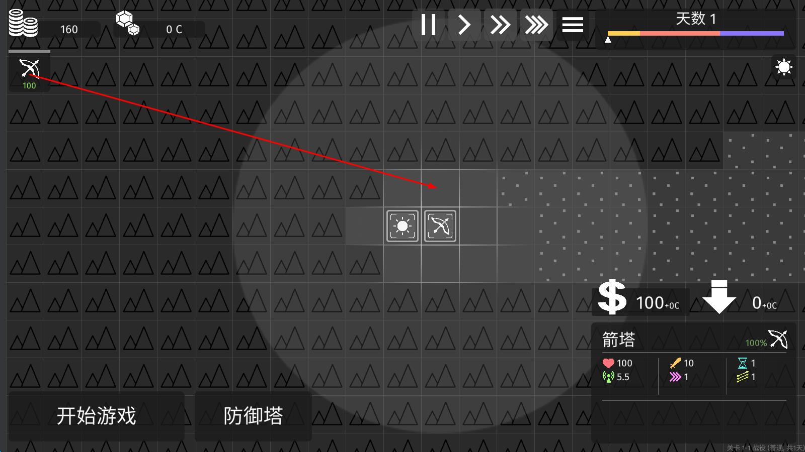1、进入游戏,依据关卡地形与敌人进攻路线,从30+种防御塔中选择合适的进行放置,搭建初始防线。