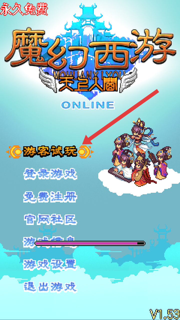2、在魔幻西游的功能菜单中,点击箭头指向的【游客试玩】的选项,快速体验游戏内容。