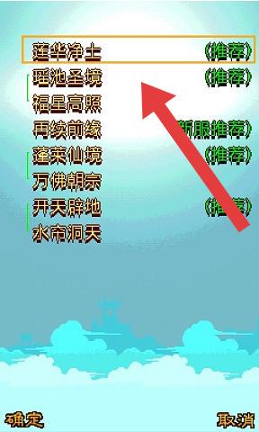 3、进入服务器选择界面,选择箭头标注的【莲华净土(推荐)】服务器,点击确定进入游戏。