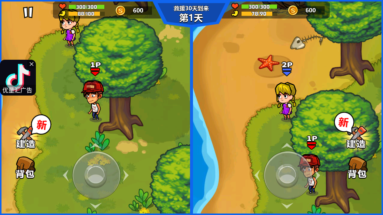 3、操控角色移动,点击“建造”做工具/营地,“背包”存物资,收集资源,维持生命,为后续30天救援做准备。