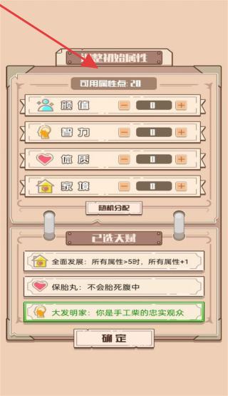 1、在“初始属性”界面,根据玩法需求,手动分配“颜值、智力、体质、家境”属性点),或点“随机分配”,确认后进入人生模拟。