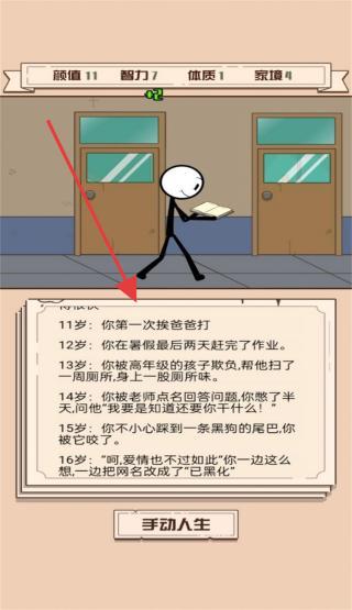 2、11-16岁剧情中,按提示触发事件(如挨爸爸打、被同学欺负),点击“手动人生”选择应对,影响后续发展,积累人生经历。