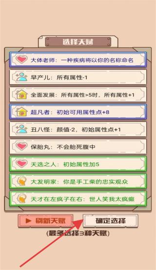 3、“选择天赋”界面,选契合策略的天赋(如“大发明家”),最多选3种,点击【确定选择】,用天赋增益开局,开启独特人生。