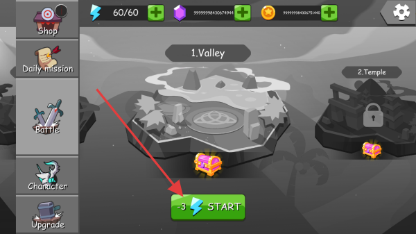 2、在地图界面,选“1.Valley”关卡,点击“-3START”消耗3点体力,进入山谷场景,开启战斗挑战。