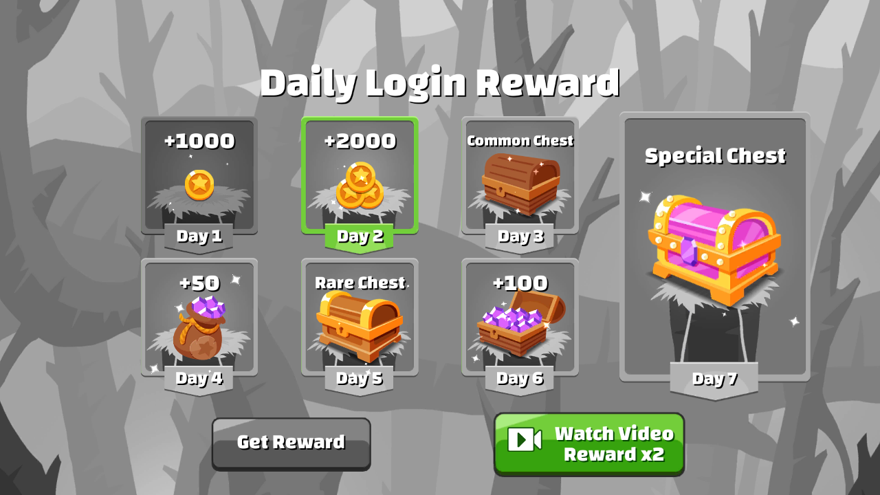 1、进入【Daily Login Reward】界面,点击“Day2” 的 “+2000 金币” 奖励,再点 “Get Reward”,领取每日签到资源,助力游戏开局。