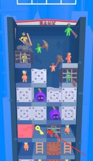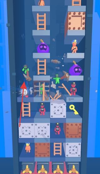 1、从建筑底层开始,操控角色避开炸弹、敌人,利用梯子攀爬,优先解救绿色小人,收集武器(如斧头),打破障碍,推进上层。