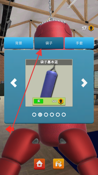 3、点击“袋子”按钮,浏览“袋子基本蓝”等样式,花费金币购买新沙袋,更换后体验不同击打反馈,提升训练乐趣。