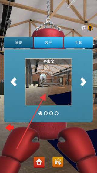 2、点击“背景”选项,在弹出界面选择“拳击馆”背景(或其他),左右滑动切换,打造专属训练场景。