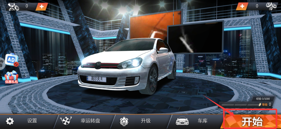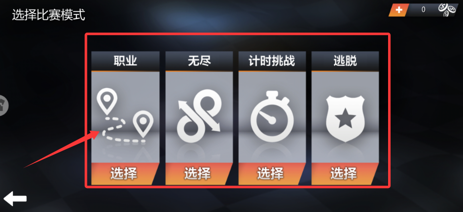 1、进入游戏,在车库中挑选好赛车后,点击“开始”即可进入模式选择界面。