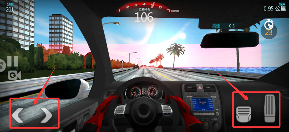 3、进入赛道上,用左侧方向键控制方向,右侧按键控刹车、油门,可驾驶赛车一路狂飙。